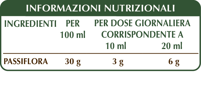 glicerina vegetale bidistillata, acqua pura, passiflora (Passiflora incarnata) erba con fiori.