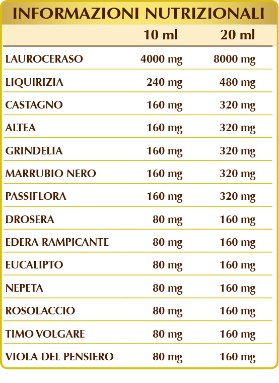 Glicerina vegetale bidistillata, acqua pura, lauroceraso (Prunus laurocerasus) foglie fresche E.I.L., liquirizia (Glycyrrhiza glabra) radici E.I.L., castagno (Castanea vesca o sativa) foglie E.I.L., altea (Althaea officinalis) radici E.I.L., grindelia (Grindelia robusta) erba con fiori E.I.L., marrubio nero (Ballota nigra sub. foetida) erba con fiori E.I.L., passiflora (Passiflora incarnata) erba con fiori E.I.L., drosera (Drosera ramentacea) erba E.I.L., edera rampicante (Hedera helix) foglie E.I.L., eucalipto (Eucalyptus globulus) foglie E.I.L., nepeta (Nepeta cataria) erba con fiori E.I.L., rosolaccio (Papaver rhoeas) fiori E.I.L., timo volgare (Thymus vulgaris) foglie E.I.L., viola del pensiero (Viola tricolor) erba con fiori E.I.L.; edulcoranti di origine naturale: glicosidi steviolici da stevia, taumatina. Con edulcoranti di origine naturale.