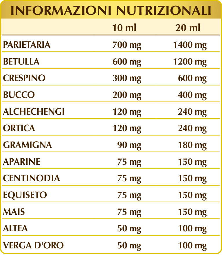 Acqua pura, glicerina vegetale bidistillata, parietaria (Parietaria officinalis) erba E.I.L., betulla bianca (Betula alba o pubescens) foglie E.I.L., crespino (Berberis vulgaris) cortecce delle radici E.I.L., bucco (Barosma betulina) foglie E.I.L., alchechengi (Physalis alkekengi) frutti E.I.L., ortica (Urtica dioica) foglie e radici E.I.L., gramigna (Agropyron repens) rizomi E.I.L., aparine (Galium aparine) erba con fiori E.I.L., centinodia (Polygonum aviculare) erba E.I.L., equiseto o coda cavallina (Equisetum arvense) erba E.I.L., mais o granoturco (Zea mays) stigmi E.I.L., altea (Althaea officinalis) radici E.I.L., verga d’oro (Solidago virga-aurea) erba con fiori E.I.L.; edulcoranti di origine naturale: glicosidi steviolici da stevia, taumatina.