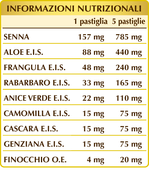 Senna (Cassia angustifolia) foglie polvere, aloe (Aloe vera) linfa o succo delle foglie E.I.S., frangula (Rhamnus frangula) cortecce E.I.S., rabarbaro cinese (Rheum palmatum) rizomi E.I.S., cellulosa microcristallina°, gomma arabica°, anice verde (Pimpinella anisum) frutti E.I.S., camomilla volgare (Matricaria chamomilla) capolini (fiori) E.I.S., cascara (Rhamnus purshiana) cortecce E.I.S., genziana (Gentiana lutea) radici E.I.S., finocchio (Foeniculum vulgare) frutti O.E., silicio biossido°°, magnesio stearato di origine vegetale°°. °Agente di carica. °°Antiagglomerante.
