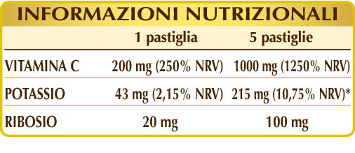 Integratore alimentare a base di potassio ascorbato, forma alcalina e non acida della vitamina C, arricchito con ribosio. La vitamina C possiede molteplici proprietà: favorisce il metabolismo energetico riducendo la stanchezza e l’affaticamento; protegge le cellule dallo stress ossidativo e rigenera la forma ridotta della vitamina E; contribuisce alla normale funzione del sistema immunitario, del sistema nervoso e alla funzione psicologica; promuove la formazione del collagene aiutando a mantenere le normali funzioni di vasi sanguigni, ossa, cartilagini, pelle, denti e gengive; incrementa l’assorbimento del ferro.