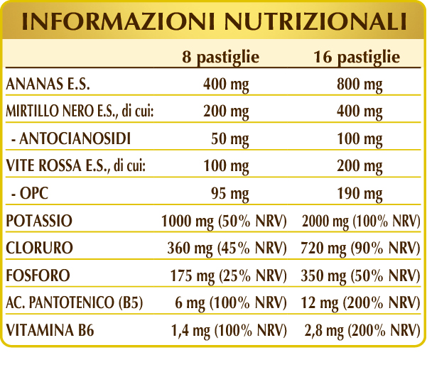 Potassio fosfato bibasico, potassio cloruro, cellulosa microcristallina°, gomma arabica°, ananas (Ananas comosus) gambi dei frutti E.S. (bromelina 2500 GDU/g), mirtillo nero (Vaccinium myrtillus) frutti E.S. (titolato al 25% in antocianosidi), potassio gluconato, potassio citrato, potassio bicarbonato, silicio biossido°°, vite rossa (Vitis vinifera) semi E.S. (titolato al 95% in proantocianidine oligomeriche o OPC), magnesio stearato di origine vegetale°°, vitamina B5 (pantotenato di calcio), vitamina B6 attivata (piridossale-5-fosfato).