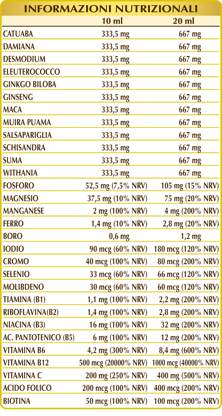Glicerina vegetale bidistillata, acqua pura, catuaba (Erythroxylum catuaba) cortecce E.I.L., damiana (Turnera diffusa) foglie E.I.L., desmodium (Desmodium adscendens) foglie E.I.L., eleuterococco o ginseng siberiano (Eleutherococcus senticosus) radici E.I.L., ginkgo biloba (Ginkgo biloba) foglie E.I.L., ginseng (Panax ginseng) radici E.I.L., maca o ginseng peruviano (Lepidium meyenii) radici E.I.L., muira puama (Ptychopetalum olacoides) legno E.I.L., salsapariglia (Smilax medica) radici E.I.L, schisandra (Schisandra chinensis) frutti E.I.L., suma o ginseng brasiliano (Pfaffia paniculata) radici E.I.L., withania o ashwagandha o ginseng indiano (Withania somnifera) radici E.I.L., magnesio glicerofosfato, vitamina C (ascorbato di sodio), manganese gluconato, vitamina B3 (inositolo esanicotinato e nicotinamide), citrato ferrico di ammonio; edulcoranti di origine naturale: glicosidi steviolici da stevia, taumatina; vitamina B5 (pantotenato di calcio), vitamina B6 attivata (piridossale-5-fosfato), sodio borato, vitamina B2 attivata (riboflavina 5-fosfato di sodio), vitamina B1 (tiamina cloridrato), vitamina B12 attivata (5-deossiadenosilcobalamina, metilcobalamina), cromo cloruro, acido folico attivato (L-metilfolato di calcio), potassio ioduro, sodio selenito, sodio molibdato, botina.
