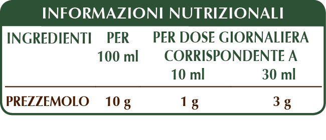Estratto Integrale Liquido analcoolico ottenuto a partire da: glicerina vegetale bidistillata, acqua pura, prezzemolo (Petroselinum crispum) frutti.