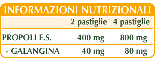 Propoli (Propolis) resina E.S. (titolato al 10% in galangina), maltodestrine da mais o riso, cellulosa microcristallina°, gomma arabica°, silicio biossido°°, magnesio stearato di origine vegetale°°.