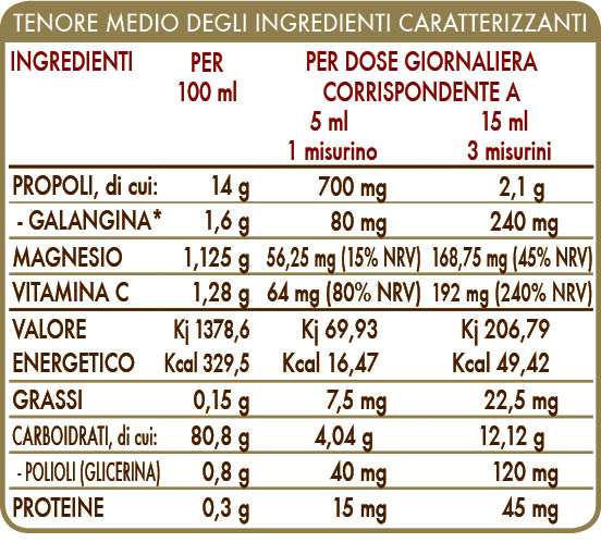 *flavonoidi totali espressi in galangina. NRV= Valore nutritivo di riferimento.