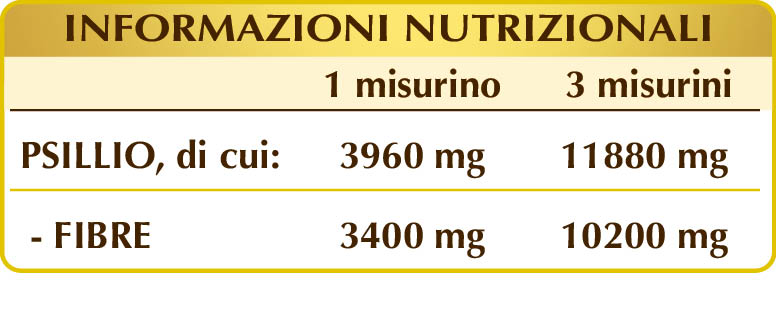 Lo psillio, grazie al suo elevato contenuto di fibre prebiotiche, aiuta a tenere pulito l’intestino normalizzando il volume e la consistenza delle feci e favorendo la normale regolarità del transito intestinale. Inoltre, svolge un’azione emolliente e lenitiva su tutto l’apparato digerente e regola il metabolismo di carboidrati e lipidi limitandone l’assorbimento durante i pasti.
