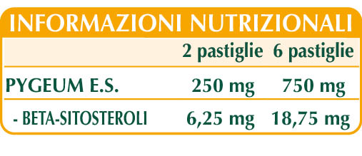 Pygeum (Pygeum africanum o Prunus africana) cortecce E.S. (titolato al 2,5% in beta-sitosteroli), maltodestrine da mais o riso, cellulosa microcristallina°, gomma arabica°, silicio biossido°°, magnesio stearato di origine vegetale°°.