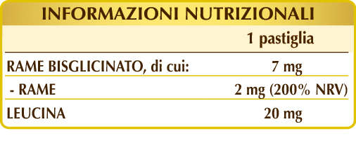 Cellulosa microcristallina°, maltodestrine da mais o riso, silicio biossido°°, (L-)leucina, gomma arabica°, magnesio stearato di origine vegetale°°, rame bisglicinato. °Agente di carica. °°Antiagglomerante.
