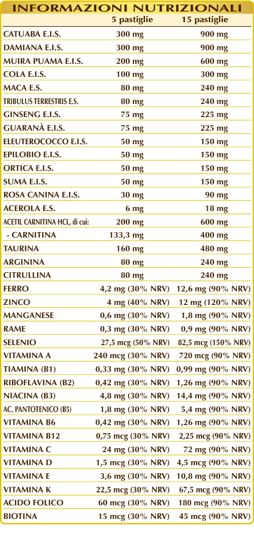 Catuaba (Erythroxylum catuaba) cortecce E.I.S., damiana (Turnera diffusa) foglie E.I.S., acetil (L-)carnitina HCL o cloridrato, muira puama (Ptychopetalum olacoides) legno E.I.S., cellulosa microcristallina°, gomma arabica°, taurina, cola (Cola nitida) semi E.I.S., (L-)arginina, (L-)citrullina, maca o ginseng peruviano (Lepidium meyenii) radici E.S., tribulus terrestris (Tribulus terrestris) frutti E.S. (titolato al 90% in saponine), ginseng (Panax ginseng) radici E.I.S., guaranà (Paullinia cupana) semi (torrefatti) E.I.S., eleuterococco o ginseng siberiano (Eleutherococcus senticosus) radici E.I.S., epilobio (Epilobium parviflorum) erba E.I.S., ortica (Urtica dioica) radici E.I.S., suma o ginseng brasiliano (Pfaffia paniculata) radici E.I.S., silicio biossido°°, zinco gluconato, rosa canina (Rosa canina) frutti E.I.S. (titolato al 70% in vitamina C), citrato ferrico di ammonio, magnesio stearato di origine vegetale°°, vitamina E di origine vegetale (acetato di D-α-tocoferile), acerola (Malpighia glabra) frutti E.S. (titolato al 50% in vitamina C), manganese gluconato, vitamina B3 (nicotinamide), vitamina B5 (pantotenato di calcio), vitamina A (acetato di retinile), rame solfato, vitamina B2 attivata (riboflavina 5-fosfato di sodio), vitamina B6 attivata (piridossale-5-fosfato), lichene (Cladonia rangiferina) tallo E.S. (titolato in vitamina D3 colecalciferolo 100.000 UI/g), vitamina B1 (tiamina cloridrato), sodio selenito, acido folico attivato (L-metilfolato di calcio), vitamina K1 (fillochinone), biotina, vitamina B12 attivata (5-deossiadenosilcobalamina, metilcobalamina). °Agente di carica. °°Antiagglomerante.