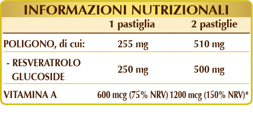 Integratore a base di estratto di poligono, ricco di resveratrolo glucoside, e vitamina A. Il poligono ha molteplici proprietà: favorisce le funzioni depurative, il drenaggio dei liquidi corporei, la fluidità delle secrezioni bronchiali, la regolarità del ciclo mestruale e la normale funzionalità dell’apparato cardiovascolare; esercita, inoltre, un’azione antiossidante e un’azione tonica, utile quest’ultima a contrastare la stanchezza fisica e mentale. La vitamina A, invece, interviene nel processo di specializzazione delle cellule, contribuisce al mantenimento di pelle, membrane mucose e capacità visiva normali e sostiene la regolare funzione del sistema immunitario.