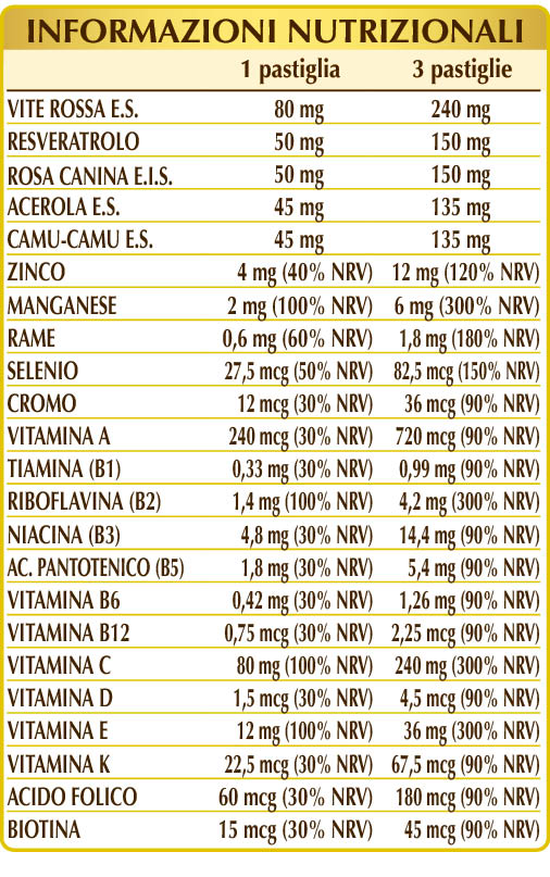 Vite rossa (Vitis vinifera) semi E.S. (titolato al 95% in proantocianidine oligomeriche), resveratrolo di origine vegetale, rosa canina (Rosa canina) frutti E.I.S. (titolato al 70% in vitamina C), cellulosa microcristallina°, gomma arabica°, acerola (Malpighia glabra) frutti E.S. (titolato al 50% in vitamina C), camu-camu (Myrciaria dubia) frutti E.S. (titolato al 50% in vitamina C), zinco gluconato, vitamina E di origine vegetale (acetato di D-α-tocoferile), manganese gluconato, silicio biossido°°, vitamina B3 (niacina), magnesio stearato di origine vegetale°°, rame solfato, vitamina B2 attivata (riboflavina 5-fosfato di sodio), vitamina B5 (pantotenato di calcio), vitamina A (acetato di retinile), vitamina B6 attivata (piridossale-5-fosfato), lichene (Cladonia rangiferina) tallo E.S. (titolato in vitamina D3 colecalciferolo 100.000 UI/g), vitamina B1 (tiamina cloridrato), cromo picolinato, sodio selenito, acido folico attivato (L-metilfolato di calcio), vitamina K1 (fillochinone), biotina, vitamina B12 attivata (5-deossiadenosilcobalamina, metilcobalamina). °Agente di carica. °° Antiagglomerante.