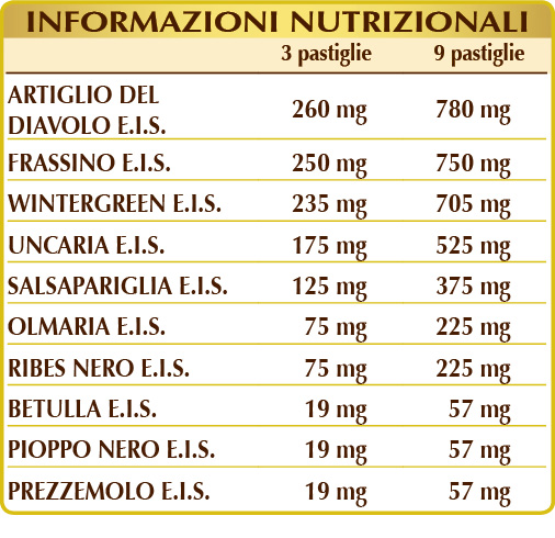 Artiglio del diavolo (Harpagophytum procumbens) radici E.I.S., frassino (Fraxinus excelsior) foglie E.I.S., wintergreen (Gaultheria procumbens) foglie E.I.S., uncaria (Uncaria tomentosa) cortecce E.I.S., cellulosa microcristallina°, gomma arabica°, salsapariglia (Smilax medica) radici E.I.S., olmaria o regina dei prati (Filipendula ulmaria) erba E.I.S., ribes nero (Ribes nigrum) foglie E.I.S., silicio biossido°°, betulla bianca (Betula alba o pubescens) foglie E.I.S., pioppo (Populus nigra) gemme E.I.S., prezzemolo (Petroselinum crispum) radici E.I.S., magnesio stearato di origine vegetale°°. °Agente di carica.