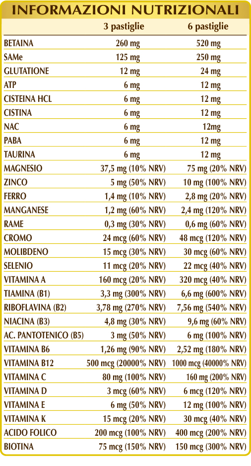 SAMe (S-adenosil metionina disolfato tosilato), cellulosa microcristallina°, gomma arabica°, betaina, silicio biossido°°, vitamina C (acido ascorbico), magnesio ossido, zinco gluconato, vitamina E di origine vegetale (acetato di D-α-tocoferile), ferro gluconato, glutatione ridotto, manganese gluconato, vitamina B2 attivata (riboflavina 5-fosfato di sodio), ATP (adenosina trifosfato sale sodico), (L-)cisteina HCL o cloridrato, (L-)cistina, NAC (N-acetilcisteina), PABA (acido p-aminobenzoico), taurina, magnesio stearato di origine vegetale°°, vitamina B3 (nicotinamide), vitamina B1 (tiamina cloridrato), vitamina B5 (pantotenato di calcio), rame gluconato, vitamina B6 attivata (piridossale-5-fosfato), lichene (Cladonia rangiferina) tallo E.S. (titolato in vitamina D3 colecalciferolo 100.000 UI/g), vitamina A (acetato di retinile), vitamina B12 attivata (5-deossiadenosilcobalamina, metilcobalamina), acido folico attivato (L-metilfolato di calcio), cromo picolinato, biotina, sodio molibdato, sodio selenito, vitamina K1 (fillochinone). E.S.= Estratto secco. °Agente di carica. °°Antiagglomerante.