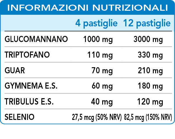 Glucomannano (Amorphophallus konjac) radici polvere (al 90% in fibre alimentari), cellulosa microcristallina°, gomma arabica°, (L-)triptofano, guar (Cyamopsis tetragonoloba) semi polvere, gymnema (Gymnema sylvestre) foglie E.S. (titolato al 75% in acido gymnemico), tribulus (Tribulus terrestris) frutti E.S. (titolato al 90% in saponine), maltodestrine da mais o riso, silicio biossido°, gelatina alimentare°°, magnesio stearato di origine vegetale°°, sodio selenito.