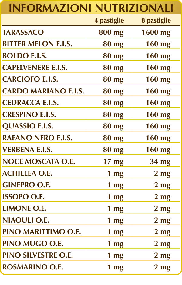 Tarassaco (Taraxacum officinale) foglie polvere, cellulosa microcristallina°, gomma arabica°, bitter melon (Momordica charantia) frutti E.I.S., boldo (Peumus boldus) foglie E.I.S., capelvenere (Adiantum capillus-veneris) erba E.I.S., carciofo (Cynara scolymus) foglie E.I.S., cardo mariano (Silybum marianum) erba E.I.S., cedracca o spaccapietra (Ceterach officinarum) foglie E.I.S., crespino (Berberis vulgaris) cortecce delle radici E.I.S., quassio (Quassia amara) legno E.I.S., rafano nero (Raphanus sativus var. niger) radici E.I.S., verbena (Verbena officinalis) erba con fiori E.I.S., silicio biossido°°, magnesio stearato di origine vegetale°°, noce moscata (Myristica fragrans) frutti (noccioli) O.E., achillea (Achillea millefolium) erba con fiori O.E., ginepro (Juniperus communis) galbuli (frutti) O.E., issopo (Hyssopus officinalis) foglie O.E., limone (Citrus limon) scorze dei frutti O.E., niaouli (Melaleuca viridiflora) foglie O.E., pino marittimo (Pinus pinaster) aghi (foglie) O.E., pino mugo (Pinus mugo, montana o pumilio) aghi (foglie) O.E., pino silvestre (Pinus sylvestris) aghi (foglie) O.E., rosmarino (Rosmarinus officinalis) sommità fiorite O.E.