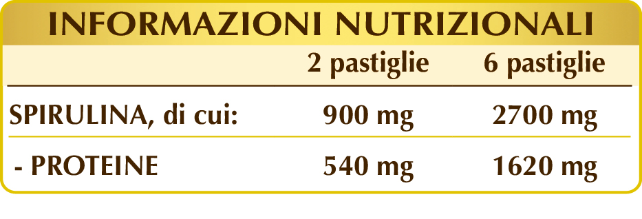 Spirulina (Spirulina maxima) tallo (alga) polvere, maltodestrine da mais o riso, cellulosa microcristallina°, gomma arabica°, silicio biossido°°, magnesio stearato di origine vegetale°°.