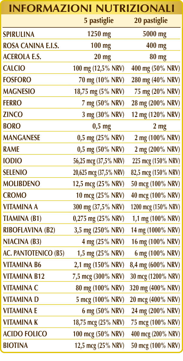 Spirulina (Spirulina maxima) alga unicellulare polvere, calcio fosfato bibasico, cellulosa microcristallina°, gomma arabica°, rosa canina (Rosa canina) frutti E.I.S. (titolato al 70% in vitamina C), ferro gluconato, calcio carbonato, magnesio glicerofosfato, magnesio ossido, silicio biossido°°, zinco gluconato, acerola (Malpighia glabra) frutti E.S. (titolato al 50% in vitamina C), vitamina E di origine vegetale (acetato di D-α-tocoferile), magnesio stearato di origine vegetale°°, vitamina B2 attivata (riboflavina 5-fosfato di sodio), sodio borato, manganese gluconato, vitamina B3 (nicotinamide), vitamina B6 attivata (piridossale-5-fosfato), vitamina A (acetato di retinile), lichene (Cladonia rangiferina) tallo E.S. (titolato in vitamina D3 colecalciferolo 100.000 UI/g), rame solfato, vitamina B5 (pantotenato di calcio), vitamina B1 (tiamina cloridrato), acido folico attivato (L-metilfolato di calcio), cromo picolinato, potassio ioduro, sodio selenito, sodio molibdato, vitamina K1 (fillochinone), biotina, vitamina B12 attivata (5-deossiadenosilcobalamina, metilcobalamina).°Agente di carica.°°Antiagglomerante.