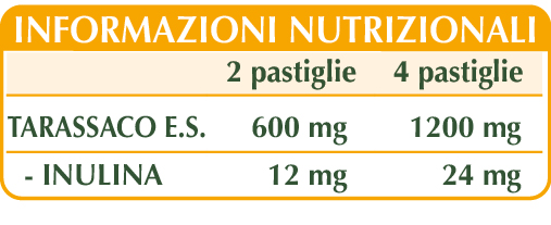 Tarassaco (Taraxacum officinale) radici E.S. (titolato al 2% in inulina), cellulosa microcristallina°, gomma arabica°, maltodestrine da mais o riso, silicio biossido°°, magnesio stearato di origine vegetale°°.