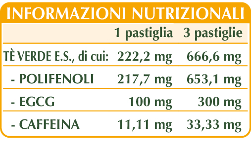 Tè verde (Camellia sinensis) foglie E.S. (titolato al 98% in polifenoli, di cui 45% epigallocatechingallato o EGCG), maltodestrine da mais o riso, cellulosa microcristallina°, gomma arabica°, silicio biossido°°, magnesio stearato di origine vegetale°°.