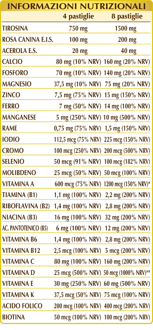 (L-)tirosina (da fermentazione), calcio fosfato bibasico, cellulosa microcristallina°, gomma arabica°, rosa canina (Rosa canina) frutti E.I.S. (titolato al 70% in vitamina C), vitamina E di origine vegetale (acetato di D-α-tocoferile), silicio biossido°°, zinco gluconato, ferro gluconato, magnesio glicerofosfato, magnesio ossido, manganese gluconato, acerola (Malpighia glabra) frutti E.S. (titolato al 50% in vitamina C), vitamina B3 (nicotinamide), magnesio stearato di origine vegetale°°, lichene (Cladonia rangiferina) tallo E.S. (titolato in vitamina D3 colecalciferolo 100.000 UI/g), vitamina B5 (pantotenato di calcio), rame gluconato, vitamina A (acetato di retinile 500.000 UI/g), vitamina B2 attivata (riboflavina 5-fosfato di sodio), vitamina B6 attivata (piridossale-5-fosfato), vitamina B1 (tiamina cloridrato), cromo picolinato, acido folico attivato (L-metilfolato di calcio), potassio ioduro, sodio selenito, sodio molibdato, biotina, vitamina K1 (fillochinone), vitamina B12 attivata (5-deossiadenosilcobalamina, meticobalamina). °Agente di carica. °°Antiagglomerante.
