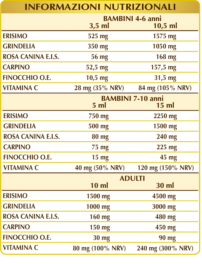 Glicerina vegetale bidistillata, miele millefiori, acqua pura, erisimo o erba dei cantanti (Sisymbrium officinale) sommità fiorite E.I.L., grindelia (Grindelia robusta) erba con fiori E.I.L., rosa canina (Rosa canina) frutti E.I.S. (titolato al 50% in vitamina C), carpino bianco (Carpinus betulus) gemme fresche E.I.L., finocchio (Foeniculum vulgare) frutti O.E.; edulcoranti di origine naturale: glicosidi steviolici da stevia, taumatina; gomma xantana. Con edulcoranti di origine naturale.