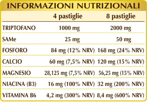 Integratore alimentare a base di triptofano e altri nutritivi. In particolare, le vitamine B3 e B6 con il magnesio contribuiscono al funzionamento del sistema nervoso e coadiuvano la normale funzione psicologica.