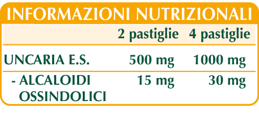 Uncaria (Uncaria tomentosa) cortecce E.S. (titolato al 3% alcaloidi ossindolici), maltodestrine da mais o riso, cellulosa microcristallina°, gomma arabica°, silicio biossido°°, magnesio stearato di origine vegetale°°.