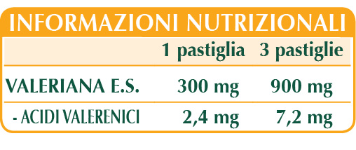 Valeriana (Valeriana officinalis) radici E.S. (titolato allo 0,8% in acidi valerenici totali), maltodestrine da mais o riso, cellulosa microcristallina°, gomma arabica°, silicio biossido°°, magnesio stearato di origine vegetale°°.