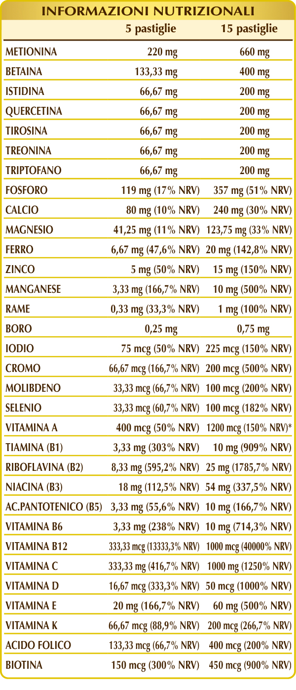 Calcio fosfato bibasico, magnesio glicerofosfato, vitamina C (acido ascorbico), cellulosa microcristallina°, gomma arabica°, (L-)metionina, betaina, (L-)istidina, quercetina, (L-)tirosina (da fermentazione), (L-)treonina, (L-)triptofano (da fermentazione), ferro gluconato, vitamina E di origine vegetale (acetato di D-α-tocoferile), zinco gluconato, silicio biossido°°, manganese gluconato, vitamina B3 (inositolo esanicotinato, nicotinamide), lichene (Cladonia rangiferina) tallo E.S. (titolato in vitamina D3 colecalciferolo 100.000 UI/g), vitamina B2 attivata (riboflavina 5-fosfato di sodio), vitamina B6 attivata (piridossale-5-fosfato), magnesio stearato di origine vegetale°°, vitamina B1 (tiamina cloridrato), vitamina B5 (pantotenato di calcio), vitamina A (acetato di retinile 500.000 UI/g), rame gluconato, sodio borato, cromo picolinato, vitamina B12 attivata (metilcobalamina, 5-deossiadenosilcobalamina), biotina, acido folico attivato (L-metilfolato di calcio), potassio ioduro, sodio molibdato, sodio selenito, vitamina K1 (fillochinone), vitamina K2 o MK-7 (menachinone) da Natto (semi di soia fermentati). E.S.= Estratto secco. °Agente di carica. °°Antiagglomerante.