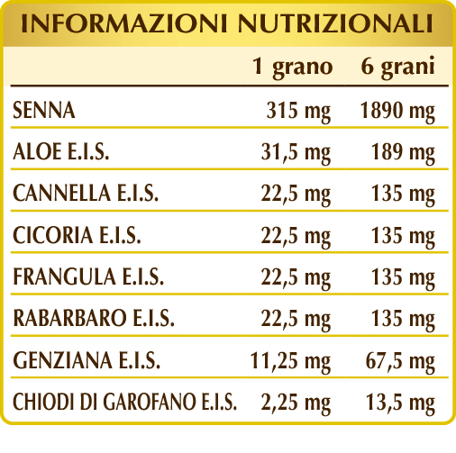 Senna (Cassia angustifolia) foglie polvere, aloe (Aloe vera) linfa o succo delle foglie E.I.S., cannella (Cinnamomum zeylanicum) cortecce E.I.S., cicoria (Cichorium intybus) radici E.I.S., frangula (Rhamnus frangula) cortecce E.I.S., rabarbaro cinese (Rheum palmatum) rizomi E.I.S., genziana (Gentiana lutea) radici E.I.S., chiodi di garofano (Eugenia caryophyllata) gemme floreali E.I.S.