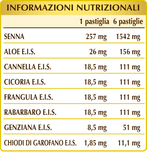 Senna (Cassia angustifolia) foglie polvere, aloe (Aloe vera) linfa o succo delle foglie E.I.S., cannella (Cinnamomum zeylanicum) cortecce E.I.S., cicoria (Cichorium intybus) radici E.I.S., frangula (Rhamnus frangula) cortecce E.I.S., rabarbaro cinese (Rheum palmatum) rizomi E.I.S., cellulosa microcristallina°, gomma arabica°, silicio biossido°°, genziana (Gentiana lutea) radici E.I.S., chiodi di garofano (Eugenia caryophyllata) gemme floreali E.I.S., magnesio stearato di origine vegetale°°.