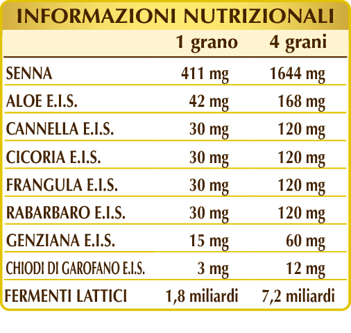 Senna (Cassia angustifolia) foglie polvere, aloe (Aloe vera) linfa o succo delle foglie E.I.S., cannella (Cinnamomum zeylanicum) cortecce E.I.S., cicoria (Cichorium intybus) radici E.I.S., frangula (Rhamnus frangula) cortecce E.I.S., rabarbaro cinese (Rheum palmatum) rizomi E.I.S., genziana (Gentiana lutea) radici E.I.S., fermenti lattici (Bacillus coagulans o Lactobacillus sporanges ATCC 7050), chiodi di garofano (Eugenia caryophyllata) gemme floreali E.I.S.