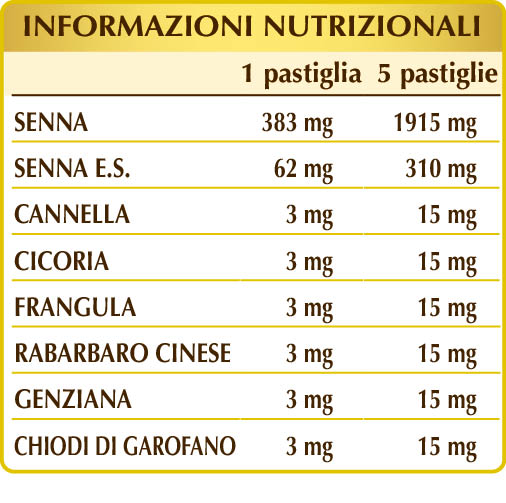 Senna (Cassia angustifolia) foglie Plv, senna (Cassia angustifolia) foglie E.S., gomma arabica°, cellulosa microcristallina°, silicio biossido°°, cannella (Cinnamomum zeylanicum) cortecce Plv, cicoria (Cichorium intybus) radici Plv, frangula (Rhamnus frangula) cortecce Plv, rabarbaro cinese (Rheum palmatum) rizomi Plv, genziana (Gentiana lutea) radici Plv, chiodi di garofano (Eugenia caryophyllata) gemme floreali Plv, magnesio stearato di origine vegetale°°. Plv= Polvere.