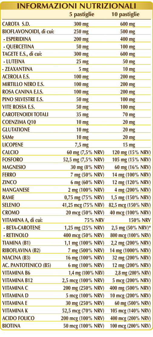 S.D.= Succo disidratato. E.S.= Estratto secco. E.I.S.= Estratto integrale secco. NRV= Valore Nutritivo di Riferimento. *Quantità di Beta-carotene corrispondente al 50% NRV come retinolo equivalente.
