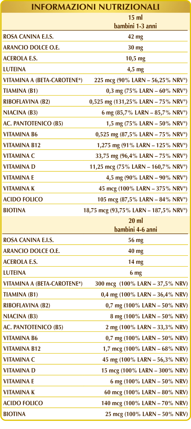*Tenore espresso in mcg di retinolo equivalenti (1 mcg retinolo = 6 mcg beta-carotene).
