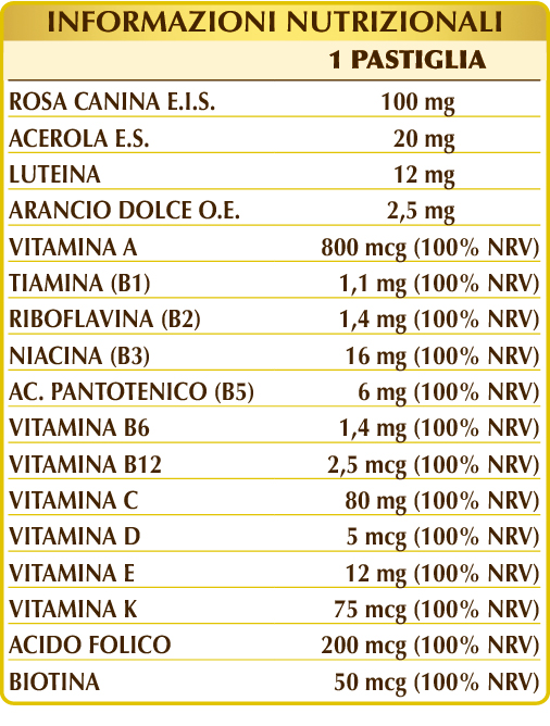 Tagete (Tagetes erecta) capolini (fiori) E.S. (titolato al 10% in luteina), rosa canina (Rosa canina) frutti E.I.S. (titolato al 70% in vitamina C), maltodestrine da mais o riso, cellulosa microcristallina°, gomma arabica°, vitamina E di origine vegetale (acetato di D-α-tocoferile), acerola (Malpighia glabra) frutti E.S. (titolato al 50% in vitamina C), vitamina B3 (nicotinamide), silicio biossido°°, vitamina B5 (pantotenato di calcio), vitamina A (acetato di retinile); aroma naturale: arancio dolce (Citrus aurantium var. sinensis o dulcis) scorze dei frutti O.E.; magnesio stearato di origine vegetale°°, vitamina B2 attivata (riboflavina 5-fosfato di sodio), vitamina B6 attivata (piridossale-5-fosfato), lichene (Cladonia rangiferina) tallo E.S. (titolato in vitamina D3 colecalciferolo 100.000 UI/g), vitamina B1 (tiamina cloridrato), acido folico attivato (L-metilfolato di calcio), vitamina K1 (fillochinone), biotina, vitamina B12 attivata (5-deossiadenosilcobalamina, meticobalamina). °Agente di carica. °°Antiagglomerante.