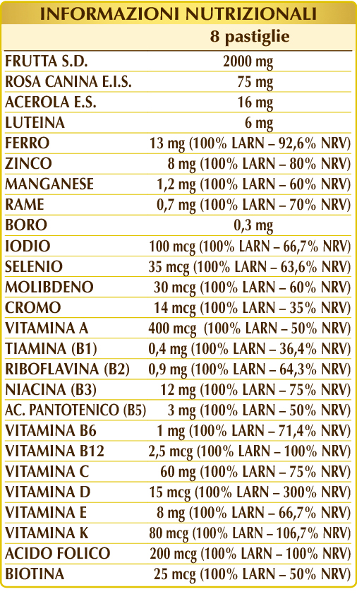 Frutta in polvere: albicocca (Prunus armeniaca), fragola (Fragaria ananassa), mirtillo (Vaccinium myrtillus); fruttosio, cellulosa microcristallina°, gomma arabica°, calcio fosfato bibasico°, ferro gluconato, rosa canina (Rosa canina) frutti E.I.S. (titolato al 70% in vitamina C), zinco gluconato, tagete (Tagetes erecta) fiori E.S. (titolato al 10% in luteina), magnesio stearato di origine vegetale°°, vitamina E di origine naturale (acetato di D-α-tocoferile), acerola (Malpighia glabra) frutti E.S. (titolato al 50% in vitamina C), vitamina B3 (nicotinamide), manganese gluconato, lichene (Cladonia rangiferina) tallo E.S. (titolato in vitamina D3 colecalciferolo 100.000 UI/g), rame gluconato, vitamina B5 (pantotenato di calcio); edulcoranti di origine naturale: glicosidi steviolici da stevia, taumatina; sodio borato, vitamina A (acetato di retinile), vitamina B2 attivata (riboflavina 5-fosfato di sodio), vitamina B6 attivata (piridossale-5-fosfato), vitamina B1 (tiamina cloridrato), acido folico attivato (L-metilfolato di calcio), potassio ioduro, cromo picolinato, sodio selenito, vitamina K1 (fillochinone), sodio molibdato, biotina, vitamina B12 attivata (5-deossiadenosilcobalamina, metilcobalamina). °Agente di carica °°Antiagglomerante.