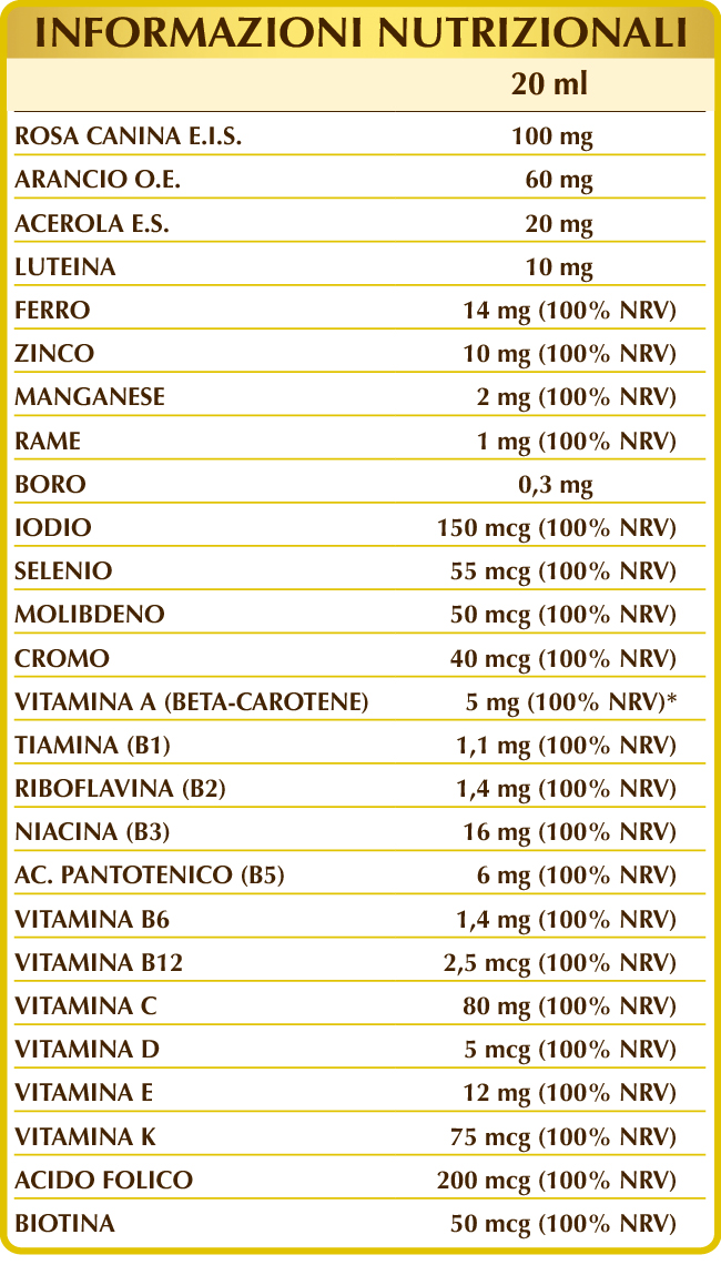 Glicerina vegetale bidistillata, acqua pura, tagete (Tagetes erecta) fiori E.S. (titolato al 5% in luteina), ferro gluconato, rosa canina (Rosa canina) frutti E.I.S. (titolato al 70% in vitamina C), zinco gluconato; aroma naturale: arancio dolce (Citrus aurantium var. sinensis o dulcis) scorze dei frutti O.E.; beta-carotene (titolato al 10%), gomma xantana, vitamina E (acetato di DL-α-tocoferile), acerola (Malpighia glabra) frutti (titolato al 50% in vitamina C), manganese gluconato, vitamina B3 (nicotinamide), rame gluconato, vitamina B5 (pantotenato di calcio), sodio borato, vitamina B2 attivata (riboflavina 5-fosfato di sodio), vitamina B6 attivata (piridossale-5-fosfato), vitamina D3 (colecalciferolo 100.000 UI/g), vitamina B1 (tiamina cloridrato), cromo picolinato, acido folico attivato (L-metilfolato di calcio), potassio ioduro, vitamina K1 (fillochinone), sodio molibdato, sodio selenito, biotina, vitamina B12 attivata (metilcobalamina, 5-deossiadenosilcobalamina).