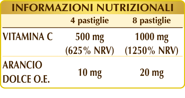 Vitamina C (palmitato di ascorbile), maltodestrine da mais o riso, cellulosa microcristallina°, gomma arabica°, magnesio stearato di origine vegetale°°; aroma naturale: arancio dolce (Citrus aurantium var. sinensis o dulcis) scorze dei frutti O.E.