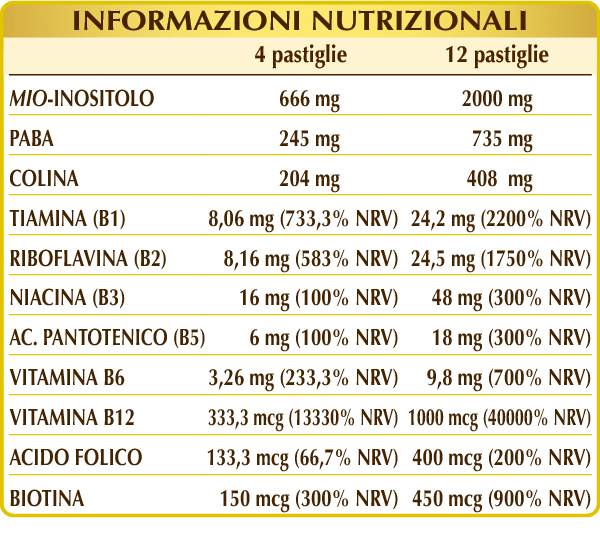 Mio-inositolo di origine naturale (estratto da semi di mais), colina tartrato, PABA (acido p-aminobenzoico), cellulosa microcristallina°, gomma arabica°, calcio fosfato bibasico°, vitamina B3 (nicotinamide, inositolo esanicotinato), vitamina B2 attivata (riboflavina 5-fosfato di sodio), vitamina B1 (tiamina cloridrato), silicio biossido°°, vitamina B5 (pantotenato di calcio), vitamina B6 attivata (piridossale-5-fosfato), magnesio stearato di origine vegetale°°; edulcoranti di origine naturale: glicosidi steviolici da stevia, taumatina; vitamina B12 attivata (5-deossiadenosilcobalamina, metilcobalamina), biotina, acido folico attivato (L-metilfolato di calcio). °Agente di carica. °°Antiagglomerante.