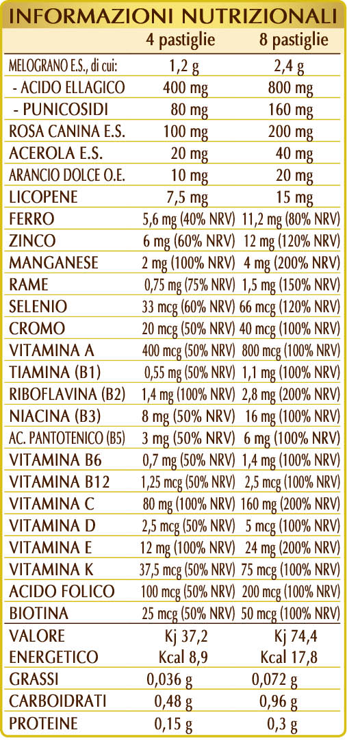 Melograno (Punica granatum) frutti E.S. (titolato al 40% in acido ellagico), melograno (Punica granatum) frutti E.S. (titolato al 40% in punicosidi), cellulosa microcristallina°, gomma arabica°, rosa canina (Rosa canina) frutti E.I.S. (titolato al 70% in vitamina C), pomodoro (Solanum lycopersicum) frutti E.S. (titolato al 10% in licopene), ferro gluconato, zinco gluconato, silicio biossido°°, vitamina E di origine naturale (acetato di D-α-tocoferile), acerola E.S. (Malpighia glabra) frutti E.S. (titolato al 50% in vitamina C), manganese gluconato; aroma naturale: arancio dolce (Citrus aurantium var. sinensis o dulcis) scorze dei frutti O.E.; magnesio stearato di origine vegetale°°, vitamina B3 (nicotinamide), vitamina B5 (pantotenato di calcio), rame solfato, vitamina A (acetato di retinile), vitamina B2 attivata (riboflavina 5-fosfato di sodio), vitamina B6 attivata (piridossale-5-fosfato), lichene (Cladonia rangiferina) tallo E.S. (titolato in vitamina D3 colecalciferolo 100.000 UI/g), vitamina B1 (tiamina), cromo picolinato, acido folico attivato (L-metilfolato di calcio), sodio selenito, vitamina K1 (fillochinone), biotina, vitamina B12 attivata (5-deossiadenosilcobalamina, metilcobalamina). °Agente di carica. °°Antiagglomerante.