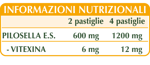 Pilosella (Hieracium pilosella) erba E.S. (titolato all’1% in vitexina), maltodestrine da mais o riso, cellulosa microcristallina°, gomma arabica°, silicio biossido°°, magnesio stearato di origine vegetale°°.