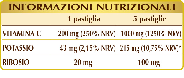 Integratore alimentare a base di potassio ascorbato, forma alcalina e non acida della vitamina C, arricchito con ribosio. La vitamina C possiede molteplici proprietà: favorisce il metabolismo energetico riducendo la stanchezza e l’affaticamento; protegge le cellule dallo stress ossidativo e rigenera la forma ridotta della vitamina E; contribuisce alla normale funzione del sistema immunitario, del sistema nervoso e alla funzione psicologica; promuove la formazione del collagene aiutando a mantenere le normali funzioni di vasi sanguigni, ossa, cartilagini, pelle, denti e gengive; incrementa l’assorbimento del ferro.