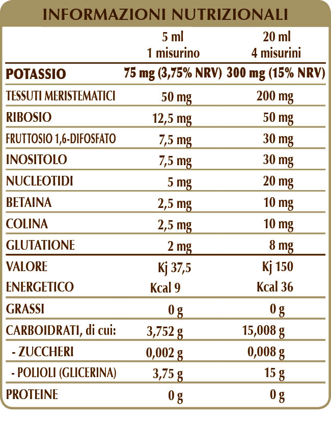Glicerina vegetale bidistillata, acqua pura, potassio citrato, potassio gluconato; tessuti meristematici freschi (1%): mais o granoturco (Zea mays var. saccharata) giovani radici, frassino (Fraxinus excelsior) gemme, castagno (Castanea vesca, sinonimo Castanea sativa) gemme, biancospino (Crataegus oxyacantha, sinonimo Crataegus monogyna) giovani getti; ribosio, fruttosio 1,6-difosfato; correttore di acidità: acido citrico; inositolo, betaina citrato, colina tartrato; miscela di nucleotidi: AMP (adenosina monofosfato), CMP (citosina monofosfato), GMP (guanosina monofosfato), UMP (uridina monofosfato); glutatione; edulcorante di origine naturale: taumatina (E957).